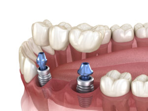 Dental implants are small biocompatible titanium posts that we surgically insert into the jaw. This allows them to function like tooth roots, bonding with the jaw and in the process, preventing the loss of mass and density. The erosion of the jaw stops, and this keeps your facial structure intact and also allows your new teeth to last for decades to come, far longer than traditional bridges or removable dentures. We then attach a crown to complete an individual one, or we could use several posts to support more secure and longer-lasting bridges and dentures.